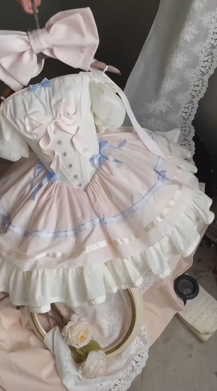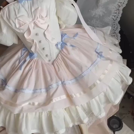 The design draws inspiration from 19th-century pastoral romance, gentle pleats, lace-trimmed collars, and puffed sleeves reminiscent of antique heirloom dresses. Every detail tells a story of innocence and grace, bringing to life the gentle elegance of a bygone era.